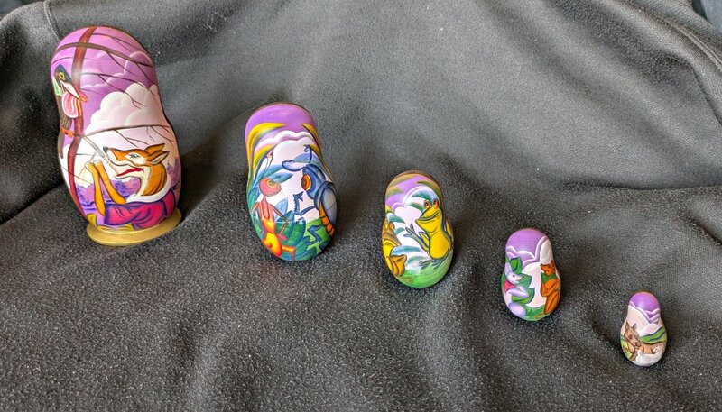 Matryoshka Set of 5 Dolls Representing GGE2000? Russian matryoshka set of 5 dolls representing GGE. $45 from shisa-630 through eBay, May, '22. This is a beautiful matryoshka. The three largest dolls are particularly well executed. I may be missing something, but I do not believe that the sequence of dolls is meant to tell this fable. They seem rather to isolate the characters involved and present them individually. The tragic note of the fable comes in in the axe in the farmer's hands in the second doll. Might the last doll suggest something like the result of the fable: we have a golden egg, and that is all that we have?