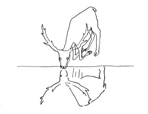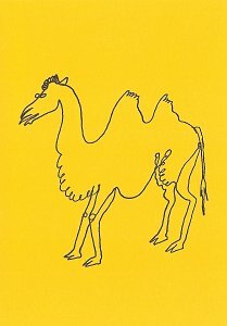Calder Animals White1992 Note cards: "Calder's Animals." 24 note cards with envelopes. New York Public Library and the Metropolitan Museum of Art. Published by MOMA. Printed in the USA. 4" x 5.25". Unknown source. I rejoiced when I first found these cards. Someone other than I recognized what a lively artist Calder is, particularly in his depiction of fables. The less happy thought here is that several of the images selected here present not fables but animals. The subjects are: "Camel"; "Lion and Gnat"; "Horse and Lion"; Dog, Sheep, and Wolf"; "A Stag Drinking"; and OF. Of the original 24 cards, we still have 16, with each of the six types represented. I offer here what seem to me the best two cards. Compare these cards with the yellow Calder cards also in our collection.