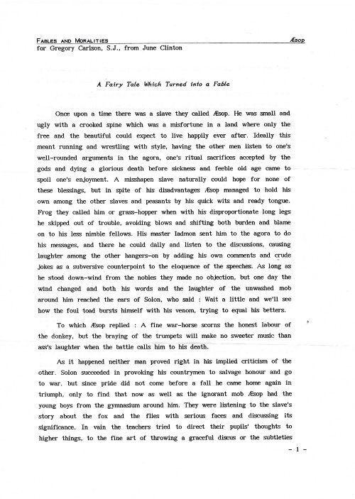 A Fairy Tale Which Turned into a Fable1992 A Fairy Tale Which Turned into a Fable. Fable written for Gregory Carlson, S.J., by June Clinton. Sent with a letter from the author, Sept., '92. Delightful story about Solon, Aesop, and Croesus, asking which of the three had the happy ending and concluding that no one lives happily ever after. I would add: "And some do not more than others"! A delightful unique gift.