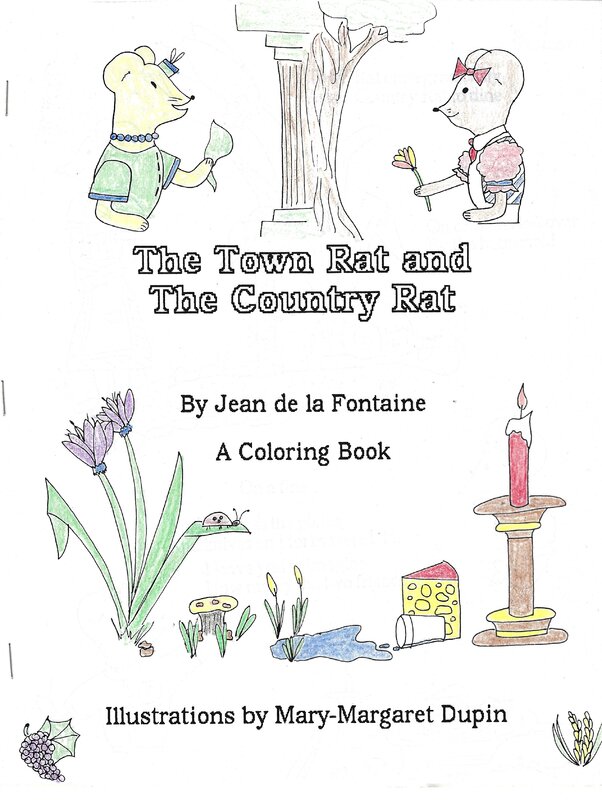 “The Town Rat and the Country Rat: By Jean de la Fontaine: A Coloring Book.”1992 “The Town Rat and the Country Rat: By Jean de la Fontaine: A Coloring Book.” Illustrations by Mary-Margaret Dupin. Presumably for requirements in a fable course at Georgetown University. Several outstanding exemplars remain from many student “creative projects” from courses on ancient literature and especially on fables. Here is one of the best. The text is by Walter Thornbury about 1870. The illustrations are delightful! It is such a pleasure to come back to them now (January, ’26)! I give a sample below the cover-page. Do not miss the cat entering right!