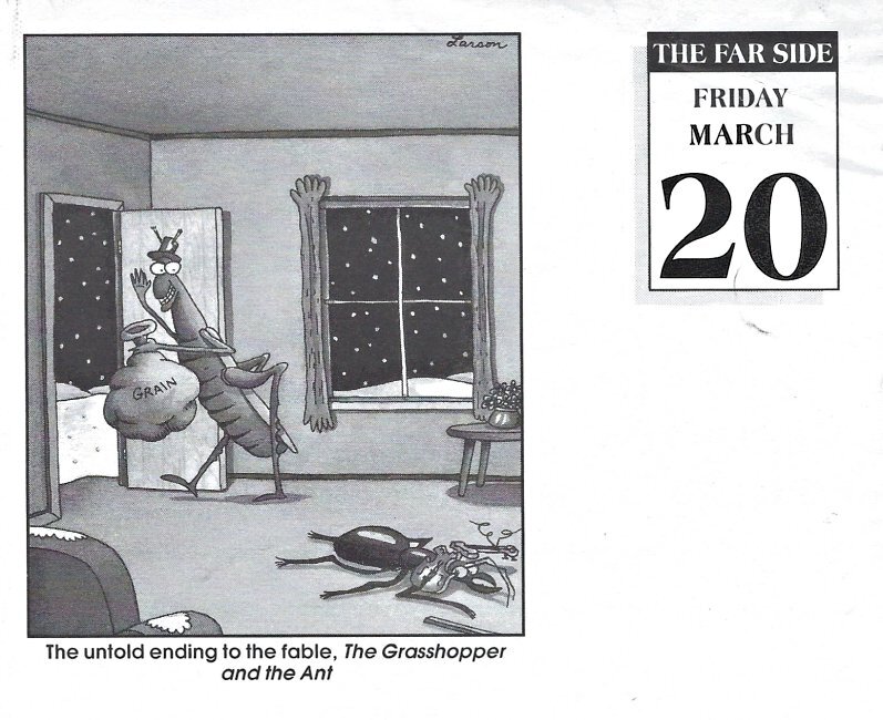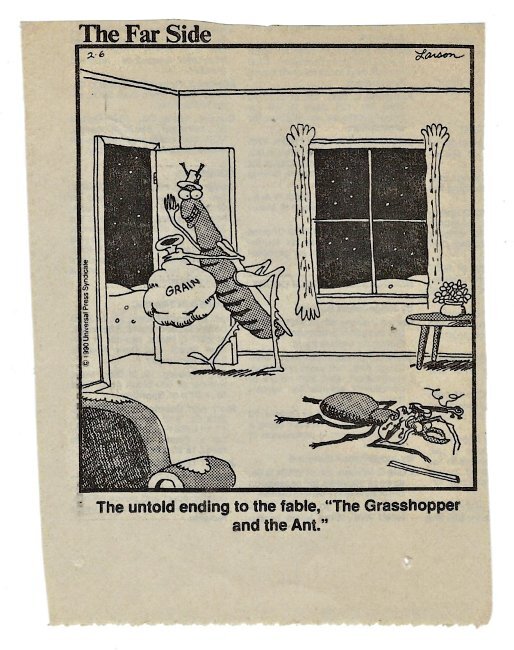 Far Side Cartoon Featuring the Grasshopper and Ant.”1999? Far Side Cartoon Featuring the Grasshopper and Ant.” Gary Larson. Calendar for Friday, March 20, 1999? Unknown source. The cartoon asks what might have happened after the fable’s usual ending, which has the ant shutting out the freezing, starving grasshopper. Here the grasshopper kills the ant with his violin and marches off with a bag of grain. Is he waving good-bye? An online entry says that the cartoon was originally published in 1988.