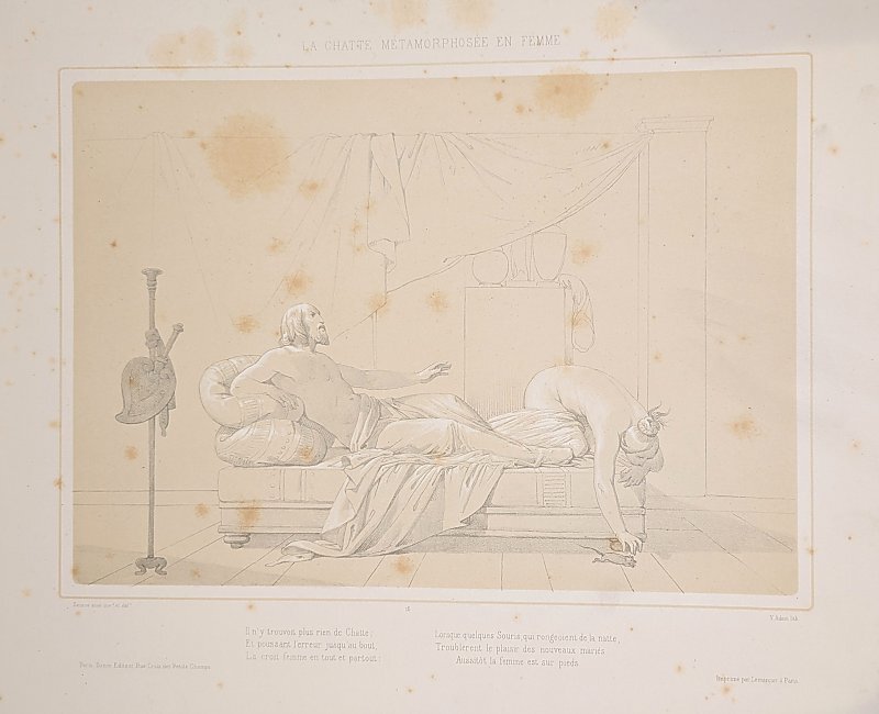 Fables de La Fontaine: Recueil de croquis composé et dessiné par Seurre Ainé1849 Fables de La Fontaine: Recueil de croquis composé et dessiné par Seurre Ainé. Bernard Gabriel Seurre, lithography by Victor Adam. Hardbound. Paris: Bance Editeur. €340 from Antiquariaat De Keerkring, Malden, Netherlands, Jan., ‘25. “Collection of Sketches.” Seurre Ainé was a pen name for Bernard Gabriel Seurre. This massive book – 22¼” x 15” and over 17 pounds in weight – is the loving creation of Harry J. Hendriks at Antiquariaat De Keerkring in Malden, Netherlands. He mentioned that it cost him €150 to have it skillfully rebound. And skillfully rebound it is! Between its covers, after a title-page, is the complete set of 96 sketches. Their style is eminently “classical,” with half-naked figures dressed in Greek clothing and surrounded by classical architecture. Each sketch has a fable title from La Fontaine at its top, a short selection of the fable’s verse under the illustration, with a small serial number just below the picture. Among the best for me are 2W (8-9); “Teacher and Drowning Child” (10); CW (15); MSA (16-20); “Ass and Lapdog” (28); “Eye of the Master” (38); “Old Woman and Two Servants” (44-46); “Young Widow” (59-61); MM (64-65); “Cobbler and Banker” (69-72); and “Gardener and Bear” (74). This is a wonderful, unique addition to the collection!