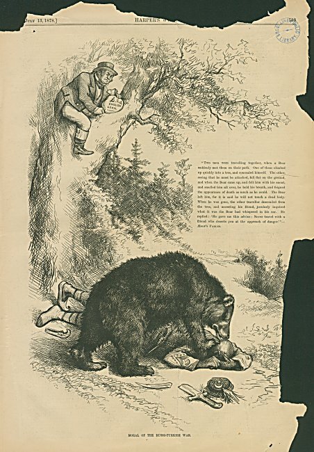 "The Moral of the Russo-Turkish War"1878 “Moral of the Russo-Turkish War.” Full-page cartoon in Harper’s Weekly, July 13, 1878. Page 553. Unknown source. Do I have my history right that the Ottoman gentlemen with a loan from Great Britain is avoiding danger and has left his Turkish ally to suffer at the hands of the Russian bear? For me, the upshot of this strong cartoon is: readers of Harper’s in 1878 knew this fable of “The Bear and the Two Travelers.” Life has changed since then!