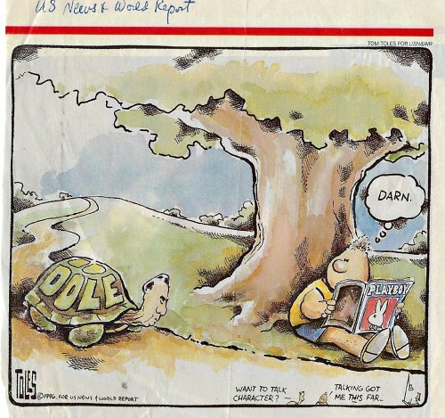 Tom Toles, US News and World Report1996 Tom Toles, US News and World Report. Bob Dole and Bill Clinton as Tortoise and Hare. Tom Toles. US News and World Report. 1996. Unknown source. The plodding tortoise wants to talk character as the hare reads Playboy Magazine. The hare answers “Talking got me this far.”