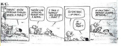Johnny Hart Comic2002 B.C. Johnny Hart. Xerox copy of a four-panel cartoon strip on fables, morals, and “mythical.” Creators Syndicate. Unknown source. This strip explains why careful critics of fables go crazy when people describe them as “you know, myths, fairy tales….”