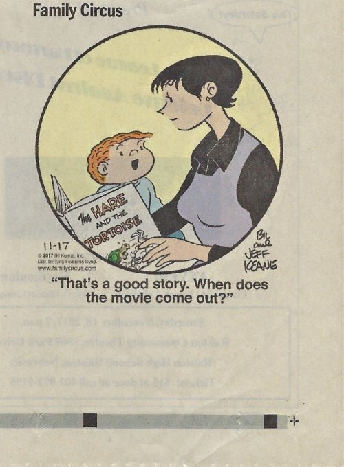 Family Circus comic2017 Bill and Jeff Keane, “Family Circus.” King Features. Unknown source. The fun here rests on the presumption that every good story is made into a film. Actually, with the book that mother is reading to this precocious child, that turns out to be true!