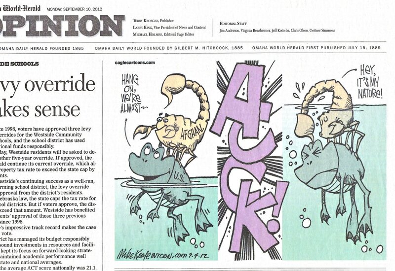 “The Frog and the Scorpion.”2012 “The Frog and the Scorpion.” Syndicated colored cartoon by Mike Keefe appearing in the Omaha World-Herald’s opinion page on September 10, 2012. Personal find. The three panels of the cartoon tell the traditional fable well. A good trip among supposed friends gets interrupted when the scorpion suddenly kills the frog. Why? “That’s my nature.” So Afghanistan is killing the country (USA) that was bringing it to supposed safety.
