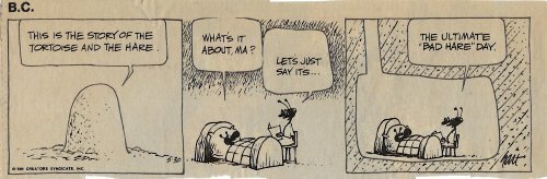"Bad Hare Day" Comic1984 B.C. “Bad Hare Day.” Johnny Hart. Creators Syndicate. Unknown venue. Unknown source. Yet another play on the word “hare.” Part of the fun here is the way ants live in their below-ground home.