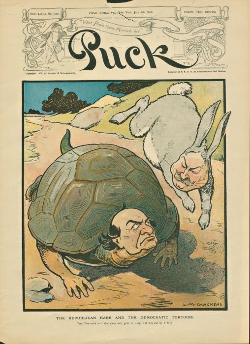Puck cartoon cover “The Republican Hare and the Democratic Tortoise.”1908 Puck cartoon cover “The Republican Hare and the Democratic Tortoise.” L.M. Glackens. Vol. LXIII, No. 1636. July 8, 1908. 10” x 13.7”. The tortoise says “If that chap only goes to sleep, I’ll win out by a mile.” Viewers may want to notice the tortoise’s hands. The two faces are very well done. Are they Democratic tortoise William Jennings Bryan and Republican hare William Howard Taft? Apparently Taft did not go to sleep!