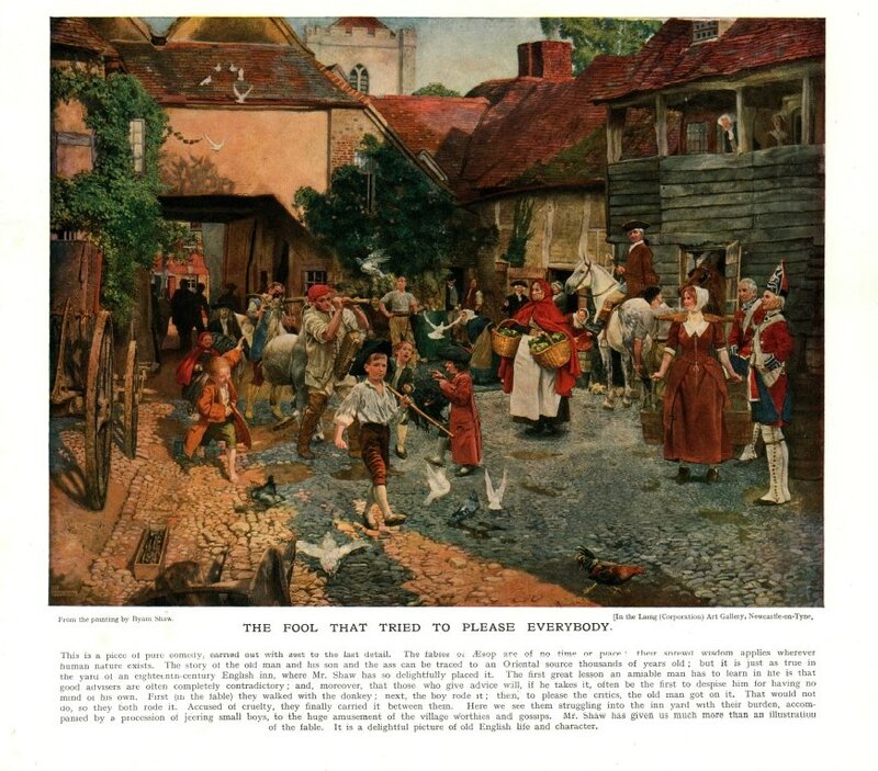 "The Fool that Tried to Please Everybody."1912 "The Fool that Tried to Please Everybody." Illustration by Byam Shaw and text on p. 21 in "Libby's Annual" for 1912. $13.50 on Ebay, Dec. 20, '06. The original painting, according to the article, is in the Lang Art Gallery. Shaw died in 1919. The painting is a more detailed presentation of MSA than I believe I have ever seen elsewhere. Libby's comment is excellent. This is a piece of pure comedy, carried out with zest to the last detail. The fables of Aesop are of no time or place: their shrewd wisdom applies wherever human nature exists. The story of the old man and his son and the ass can be traced to an Oriental source thousands of years old; but it is just as true in the yard of an eighteenth-century English inn, where Mr. Shaw has so delightfully placed it. The first great lesson an amiable man has to learn in life is that good advisers are often completely contradictory; and, moreover, that those who give advice will, if he takes it, often be the first to despise him for having no mind of his own. First (in the fable) they walked with the donkey; next, the boy rode it; then: to please the critics, the old man got on it. That would not do, so they both rode it. Accused of cruelty, they finally carried it between them. Here we see them struggling into the inn yard with their burden, accompanied by a procession of jeering small boys, to the huge amusement of the village worthies and gossips. Mr. Shaw has given us much more than an illustration of the fable. It is a delightful picture of old English life and character.