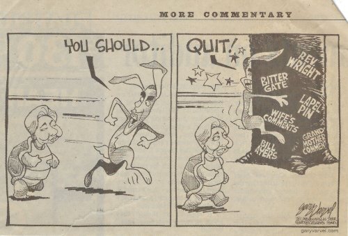 Barack Obama and Hilary Clinton as Tortoise and Hare2008 Barack Obama and Hilary Clinton as Tortoise and Hare. Gary Varvel. Indianapolis Star. Unknown source. Obama as front-running hare is telling the slow tortoise Clinton to quit when he runs into a solid tree of negative factors. He finishes with “Quit!” just as he is being knocked unconscious. She smiles.