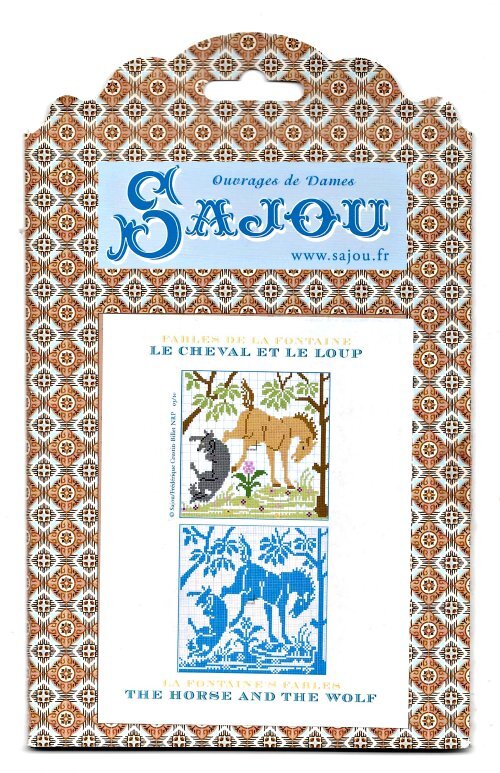 Sajou Needlepoint Fable KitsSajou Needlepoint Fable Kits. 14 of 24 available kits. From an unknown source. The manufacturer’s description for these charming designs includes this information: “To embroider on natural linen to obtain a band measuring 20cm wide and 1m50 high. Kit contents: 1.60m of natural linen band width 20cm; 22 cards of Retors du Nord: 2004, 2005, 2009, 2013, 2024, 2033, 2034, 2039, 2041, 2190, 2221, 2302, 2317, 2332, 2350, 2409, 2443, 2445 x 2, 2570, 2777, 2876; a Sajou “Créé par moi” label; full-colour pattern chart with explanations.” The latter might be the most important inclusion. As they say, it is presented in a lovely Sajou re-usable packet. Of the 24 kits, we have 14.