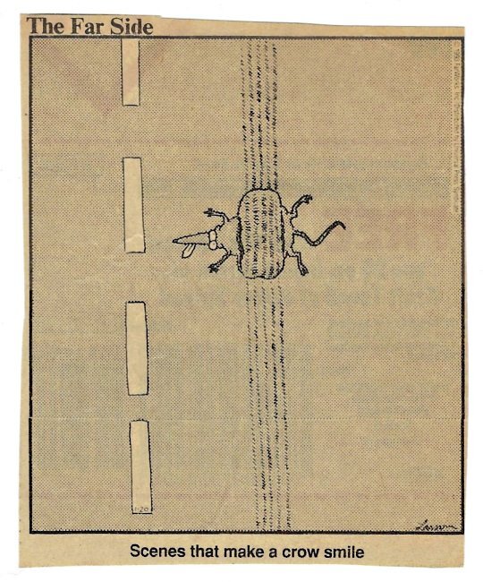 Far Side Cartoon “Scenes that make a crow smile.”1993 Far Side Cartoon “Scenes that make a crow smile.” Gary Larson. FarWorks. Universal Press Syndicate. Unknown source. The cartoon shows a roadkill. A viewer might need to look more closely to see that it is a fox that has been killed. The crow would be smiling because the fox outsmarted him in the fable and came away with the crow’s piece of cheese. The verso includes an offer with a coupon expiring in late January, 1993.