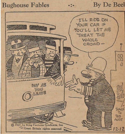 "Bughouse Fables"1927 “Bughouse Fables.” 22 newspaper cartoons by Paul Fung and (Clarence “Billy”) De Beck. King Features Syndicate. From Wes Baldwin, Bartow, FL. I learned in researching these cartoons that “bughouse” means “crazy.” Billy De Beck was the creator of Barney Google. This is a typical case of “fable” not referring to the sort of thing associated with the name of Aesop. Since I have come across them, I preserve them here. The basic movement of these cartoons is role reversal, as when a criminal asks a police officer where he can best sell a used car. In the simplest and last of these, a child in his crib smokes a cigar. Fun still 98 years later.
