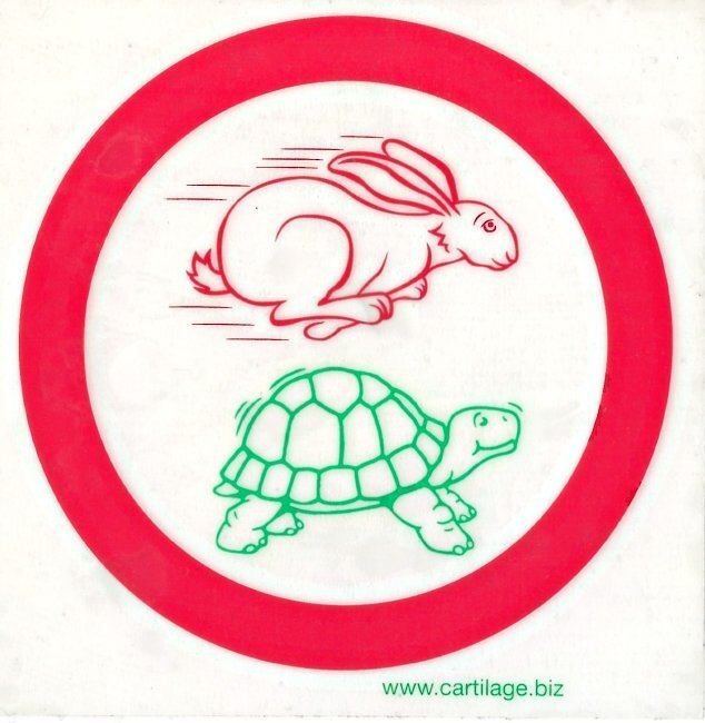 Eleven reverse stickers illustrating TH2015? Eleven reverse stickers illustrating TH within a red circle. 4.25” square. With adhesive on the image side, covered by a thick transparency. Unknown source. I wonder where and how we got these! Eight have www.cartilage.biz at the bottom, and 3 have www.hareandtortoise.co.uk. The latter seem to belong to a London restaurant. I removed the transparent cover of one to scan it. Stickers generally have the adhesive on the verso. And so I wonder how these were meant to be used. Red hare, green tortoise.