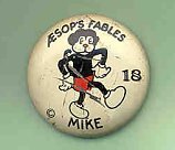 "Aesop's Fables - Mike - 18."1930? One pinback 15/16" in diameter, labelled "Aesop's Fables - Mike - 18." $2 from Connie Amos, Flushing, OH, through Ebay, March, '00. Against a white background we find "Aesop's Fables" at the top, "Mike" at the bottom, and "18" on the right side. In the center is a dancing mouse. Printed around the rim of the back: "Western Theater Premium Co., 1956 S. Vermont Ave., Los Angeles, Cal." I presume these pinbacks were theater give-aways. Again, I got lucky on the price!