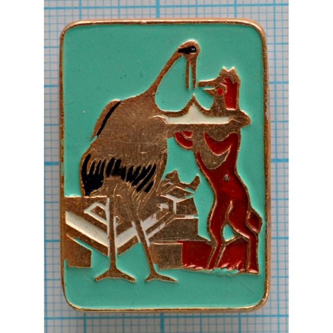 Pin. Fox Serves Stork Food.2000? Pin. Fox Serves Stork Food. U13K. 1" x 1.4". USSR. Unknown source. Some research online strong suggests that this is one of a set of fairy tale pins and that no other fables belong to the set. FS in Russia became a highly developed folktale. I am curious about what sort of food the fox here is bringing the stork.