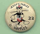"Aesop's Fables - Waffles - 22."1930? One pinback 15/16" in diameter, labelled "Aesop's Fables - Waffles - 22." $2 from Connie Amos, Flushing, OH, through Ebay, March, '00. Against a white background we find "Aesop's Fables" at the top," Waffles" at the bottom, and "22" on the right side. In the center is a dancing animal. Printed around the rim of the back: "Western Theater Premium Co., 1956 S. Vermont Ave., Los Angeles, Cal." I presume these pinbacks were theater give-aways. Again, I got lucky on the price!