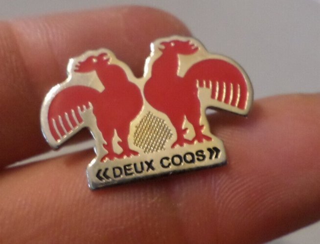 Enamel Pin of La Fontaine's "Deux Coqs."1990? Enamel Pin of La Fontaine's "Deux Coqs." 1" x .7". €6.90 from lolospin through Ebay, Oct., '23. This looks to me like one pin that belongs to a larger set. There's the challenge for the collector!