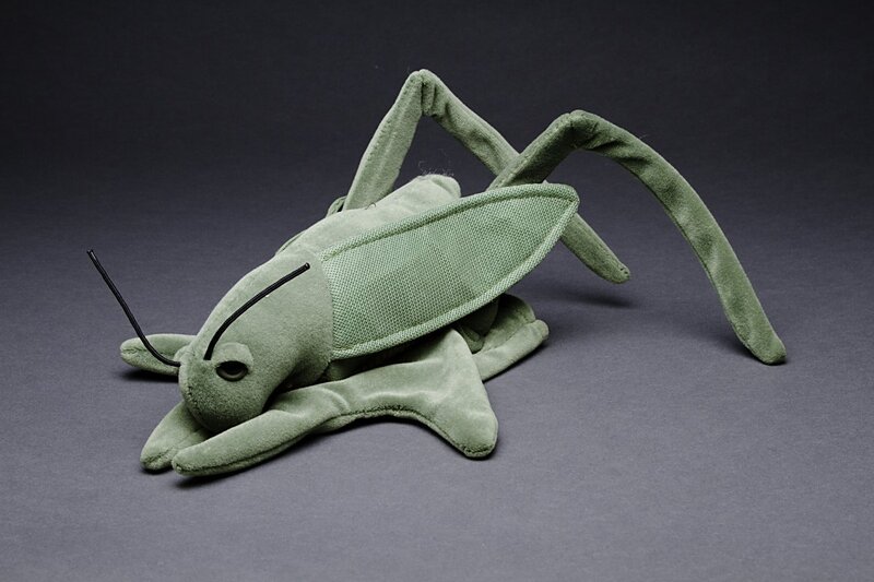 Grasshopper puppet with attached Aesop's fable "The Grasshopper and the Ants."1990? Grasshopper puppet with attached Aesop's fable "The Grasshopper and the Ants." "Folktails" series by Folkmanis, Inc., Emeryville, CA. Made in Korea. As the tag shows on this puppet in excellent condition, the puppet is meant to recall GA. The version attached to this delightful little fellow has the ants answering at the end of the fable: "If you were foolish enough to sing all summer, then you will have to go to bed without any supper in the winter." I have never seen that ending before. Two well-formed rear legs are nicely filled out, but the manipulator of this puppet has four front legs to control with four different fingers. As often in Folkmanis creations, the eyes are excellently rendered.