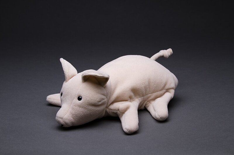 Pig puppet with attached Aesop's fable "The Pig and the Sheep."1990? Pig puppet with attached Aesop's fable "The Pig and the Sheep." Puppets with a Tale: Folktails: Folkmanis, Inc., Emeryville, CA. Made in Korea. Gift of John and Susan Carlson, Christmas, 1991. The tale on the card attached to this puppet tells of the pig who happened among sheep and was upbraided for all his squealing when the shepherd caught him. The pig answers the sheep: “He nly wants you for your wool, but he wants me for bacon.” A clever manipulator can get fingers into all four legs and the face.