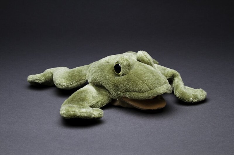 Frog puppet with attached Aesop's fable "Is There A Doctor In the Pond?"1985? Frog puppet with attached Aesop's fable "Is There A Doctor In the Pond?" Puppets With a Tale: Folktails" series by Folkmanis, Inc., Emeryville, CA. Made in Korea. Gift of Margaret Carlson Lytton, Christmas, '90. Extra exemplar with a detached card from a flea market, August, ’10. The card attached to this frog in the “Puppets With a Tale” series tells the story of the frog who suddenly announced to the animals that he was a physician. A clever fox retorted “Well, I’m certainly no doctor, but it looks to me like YOU certainly could use one.” He elaborates on the frog’s nervous, jumpy behavior, his sick sounding croaking, crooked legs, and blotched and wrinkled skin. The four paws have patches of Velcro to put legs together. A clever manipulator can get fingers into the upper and lower jaws as well as both front legs.