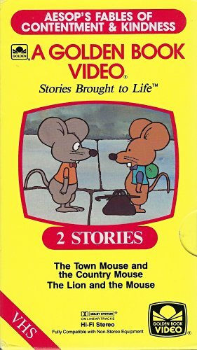 Aesop's Fables of Contentment & Kindness1986 Aesop's Fables of Contentment & Kindness. The Town Mouse and the Country Mouse; The Lion and the Mouse. Golden Book Video. About 25 minutes. ©1986 Dolmatch. Racine: Western Publishing Company. One extra copy. Simple, even rudimentary animation. The framework is provided by three monkeys, who appear before the first fable, between the two, and after the last. TMCM (about 10 minutes) presents little Mike bored in the country telling his mama that he needs to go see the world. The train takes him to town, where he meets cousin Max fresh from being chased by a cat. They eat well--chocolate and cheese!--in Max's well furnished hole. Mike is frightened at night by an "owl" clock and next morning by traffic and a ringing bell. They sneak past the sleeping cat only to be chased. A woman attacks with a broom. Mike is happy to return to Mama. The monkeys moralize variously, even contradictorily: "Sometimes things are better than you may think, and we should all appreciate what we have. Follow your heart but be prepared for the consequences. Mike had to find out for himself that country life wasn't such a bad thing after all." In LM (about 10 minutes), Malcolm is bringing cactus fruit home to his sick mother. He is followed and then chased by a fox into a hollow log, which the fox rolls over the cliff. Malcolm staggers home. His sister Amanda goes back ahead of him to get the cactus fruit; by now the fox has it on a string. Amanda jabs him in the foot. In running off, Amanda runs onto a lion. Malcolm begs the lion to spare her. The lion does not laugh but yields since they would not make much of a meal. Amanda soon announces that the lion has been caught. After being released by them, the lion apologizes.