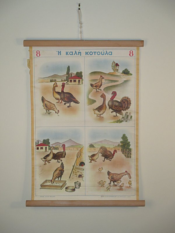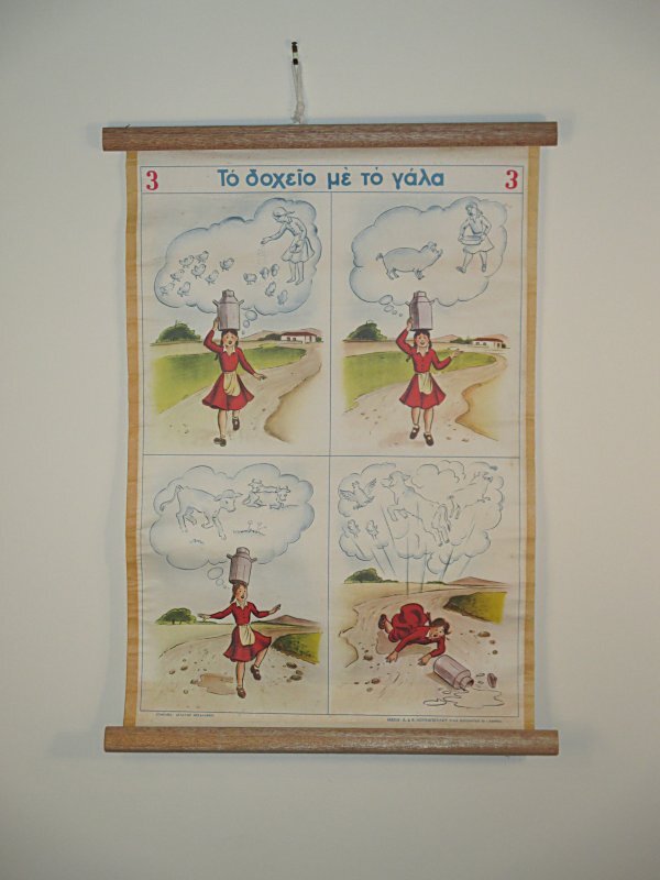 1975 Ten Greek schoolroom scrolls for hanging up in a classroom, each illustrating a fable in four scenes with a title. Wooden endpieces with an almost canvas-like paper for the pictures themselves. Gift of Martin and Ulrike Kölle, August, 2012. The fables pictured include :