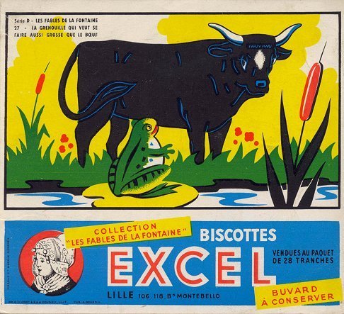 1980? Collection "Les Fables de la Fontaine." Five brightly colored blotters, all from "Serie D," advertising Biscottes Excel. 5 3/8" x 6 5/8". Imp. G. Elipret & E. & A. Dourdin, Lille. Pub. A. Dourdin, Lille. $5 each for four from Dany Wolfs, Roeselare, Belgium, Nov., '01. OF for $5 from Mme Denise Debuigne, Rennes, France, Feb., '02. Extra copy of " Le Chat, la Belette et le petit Lapin" for $5 from Mme Denise Debuigne, Rennes, France, May, '03.
