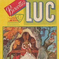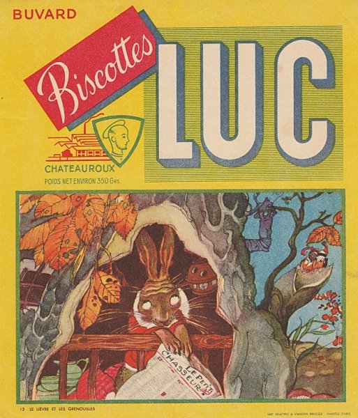 1950? Three numbered blotters for "Biscottes LUC" of Chateauroux, each depicting a single La Fontaine fable. 6" x 7". Printed by Beuchet & Vanden Brugge, Nantes and Paris. $18 from Bertrand Cocq, Calonne Ricouart, France, Sept., '18.
