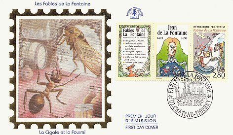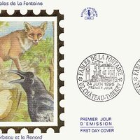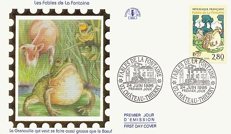 1995 Set of six FDC envelopes featuring a first-day postmark, one (or on the first card, three) of the La Fontaine fable stamps issued on June 24, 1995, and a hologram-like art work surrounded by a gold frame like the outer edges of a stamp. Nice: Éditions Philatélique. $29.50 for the set of six from Alexandre Przopiorski, Lyon, France, April, '99.