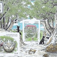2021 Postal souvenir of the 400th anniversary of the birth of Jean de La Fontaine, consisting of a gummed scene including two stamps. Those stamps are perforated sections to be removed from the surrounding image. £8.99 from The Joy of Stamps through Ebay, Nov., '21.