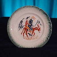 1920? Eleven plates -- including three extras -- illustrating fables of La Fontaine. 7½" white plate bordered in a green floral pattern with a central design in two or three of four colors: green, blue, brown, and tan. The back gives the fable title in block letters along with an FNG symbol surrounded by "Faïencerie Nouvelle, Givors, France." $10 to $15 each from a variety of sellers including Mary Ellen Kennedy, Larchmont, NY through Ebay, Nov.,' 99 and April, '00.