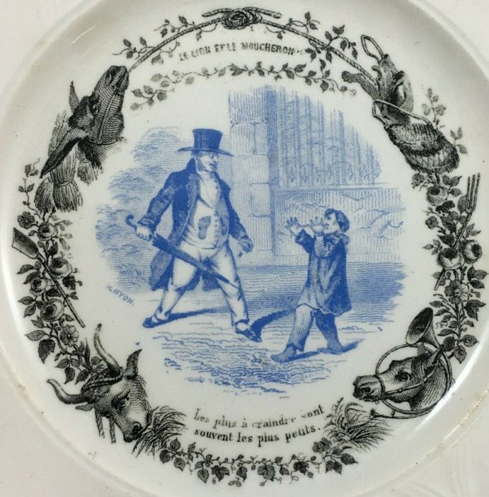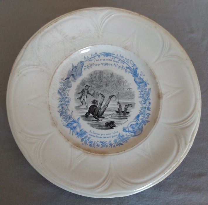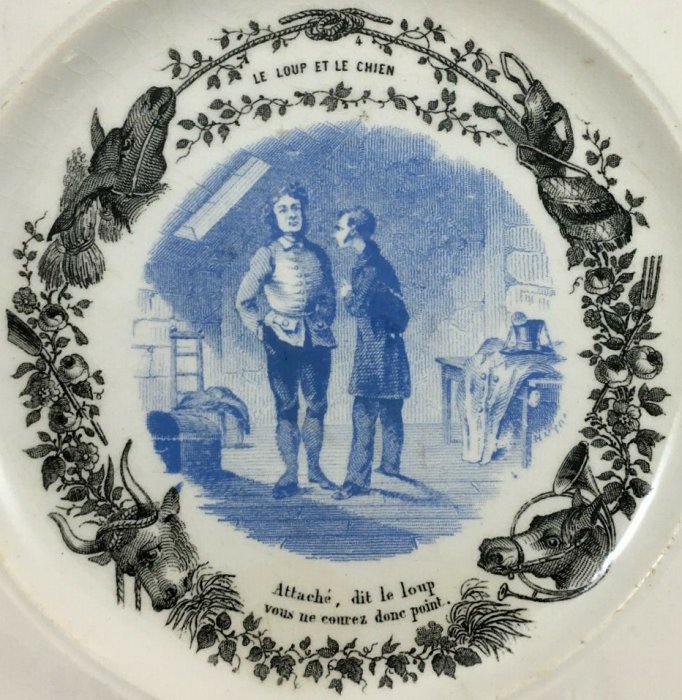 1910? Seven "talking plates" by Hautin Boulenger & Cie, in Choisy-le-Roi, France, featuring illustrations of fables of La Fontaine. 7¾" in diameter. €8 each from Jobey Antique Shop, Normandie, France, through Ebay, Oct., '20. Four further plates from artdelatable50 through Ebay for €46, Jan., '22.