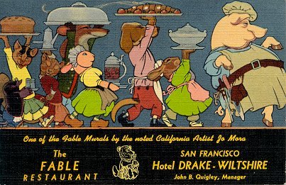 1925? "The Fable Restaurant" postcard with mural by Jo Mora, advertising The Fable Restaurant in San Francisco's Hotel Drake-Wiltshire. 5 3/8" x 3½". C.T. Art-Colortone. Genuine Curteich, Chicago. $15.65 from Jill Curran, Little Rock, AR, through Ebay, May, '99. Extra copy for $10.76 from Dan Vidaurri, Chico, CA, through Ebay, Oct., '00.
