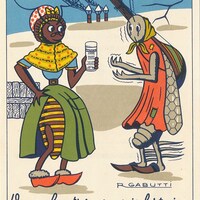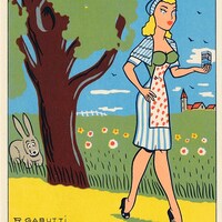 1950? Fourteen advertising cards by R. Gabutti in an envelope. All have advertising on the verso; about half also have advertising as part of the image. $168 from Bertrand Cocq, Calonne Ricouart, France, Sept., '18. A full set of nineteen cards in an envelope for €35.80 from le-livre, Sablons, France, through Ebay.fr, June, '20.