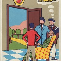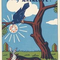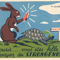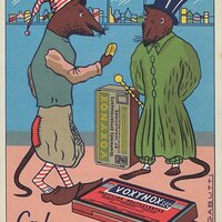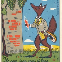 I find the artistry of these advertisements spectacular! Getting them has already set me on a quest to get the others in the set of 19 listed on the flyleaves of the envelope. There is plenty of humor in these illustrations! The advertisements seem to be for various products of Laboratoires M. De Rive in Paris. One of the two TH advertisements for Strongénol – the one with brown foreground rather than green -- was actually sent as a postcard, unfortunately without a clear date stamp. The Gabutti signature is different in these two cards. The products are sometimes worked cleverly into the fable scene, as when the crane doctor brings a tube of ointment to wounded wolf. The crow is similarly dropping not a cheese to a flatterer but medicine to a sick fox with his head bandaged up. Now the full set has arrived, found on French Ebay at the time I was cataloguing the original set here. These six new cards have their own treats. The old man is trying to reveal to his sons not the glory of a well-worked family inherited plot of land but rather the glory of cash! The country mouse is recommending Voxynox to his city slicker cousin. There is lots of fun to be had here!