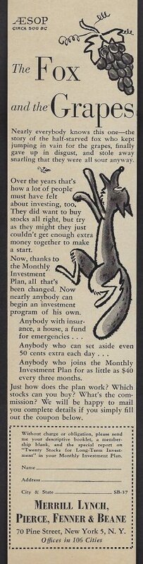 The point drawn is not far from that of the fable this time. People walk away from investing because they cannot raise the necessary money, as the fox walked away from the grapes he could not reach. Merrill Lynch has a program that allows you to save up a little bit at a time. Do not go away! Start saving now! 50 cents a day will do it! There may be a helpful cultural tip in this advertisement. It starts “Nearly everybody knows this one….” Could we say that now 65 years later?