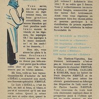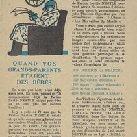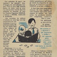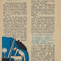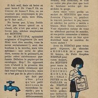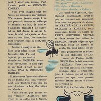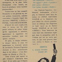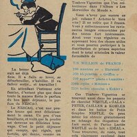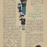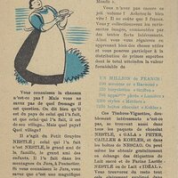 1930? Seven Nestlé advertising cards. Text and illustration on the front side of each card in duochrome black and blue. The verso of each, in black and one other color, has questions, suggestions, and a mention of Nestlé. $42 from Bertrand Cocq, Calonne Ricquart, France, Sept., '18. Four further cards for £1 each from 18otmus through Ebay, August, '21.