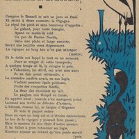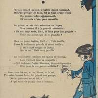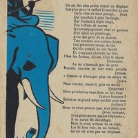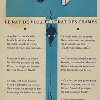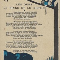 Because in many ways the backs of these cards are more interesting than the fronts, I will include each here. They seem to be tips for pupils, always including an advertisement for Nestlé chocolate in one form or another. Some backs recommend reaching to Nestlé during the times when one gets hungry between meals, for example. The "applied" fables seem to me to be forced, as when a monkey's opening a can of Nestlé saves the day for a bear family. The true story of FG turns out to include a young student who had his Nestlé and knew that the grapes were good. He got one of them! The versos offer fascinating inquiries. "Did you do your work this week?" "Let's make a collection!" "When your grandparents were babies." "Do you like dishes with cream?" My, what questions! 4¾' x 7".