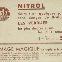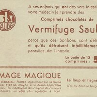 1935? Two frictographic “Image Magique” hidden page slips advertising Sauba syrups to counteract worms and warts. A child should rub a crayon on the “blank” verso and an image will appear – an image with a hidden item to find. 4⅞” x 3⅞”. $20 for the pair from Bertrand Cocq, Calonne-Ricouart, France, Sept., ’20.