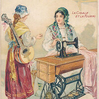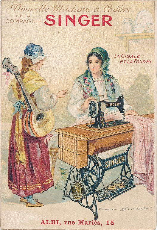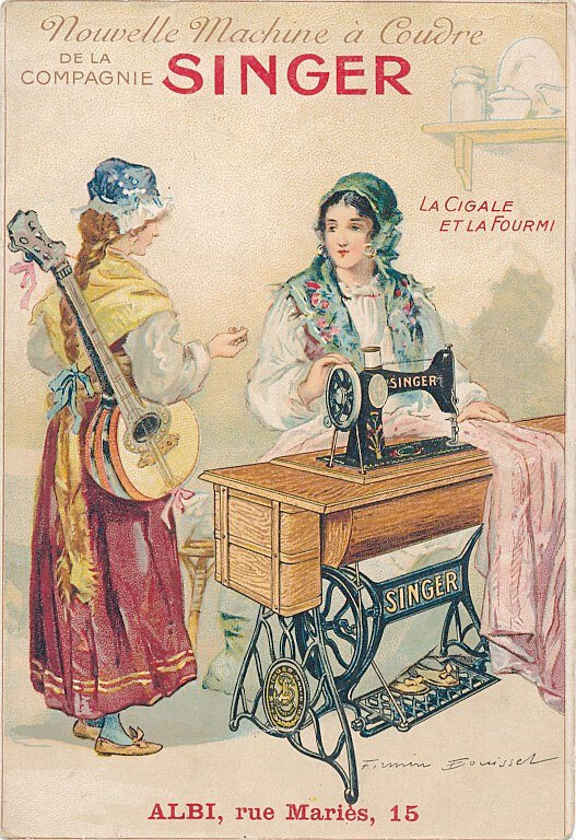 - "Nouvelle Machine à Coudre de la Compagnie Singer." "La Cigale et la fourmi." Artist: Firmin ??. Albi, rue Maries, 15. Verso is a calendar of 1912.