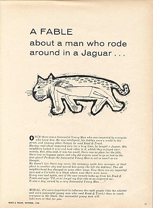 - "A Fable about a man who rode around in a Jaguar . . . ." Advertisement for Road & Track. R. Rich. Page 11 of Road & Track, October, 1958.