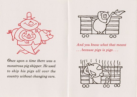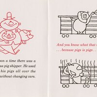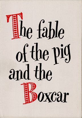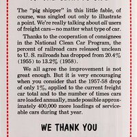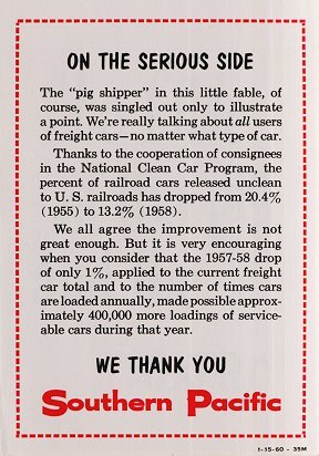 - "The fable of the pig and the Boxcar." 3¼" x 4½" fold-out brochure by Southern Pacific Railway asking users of their railroad cars to clean them afterwards.